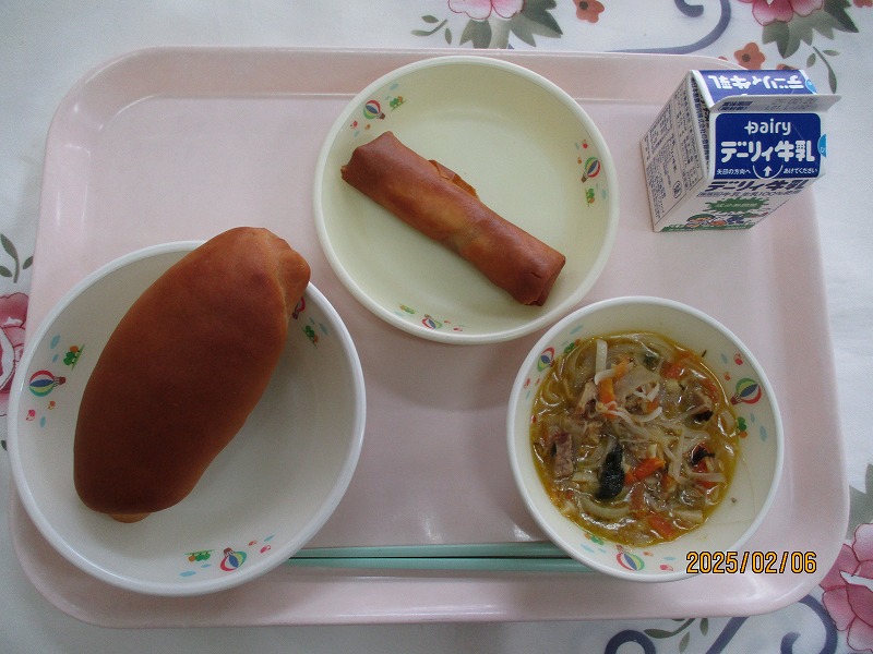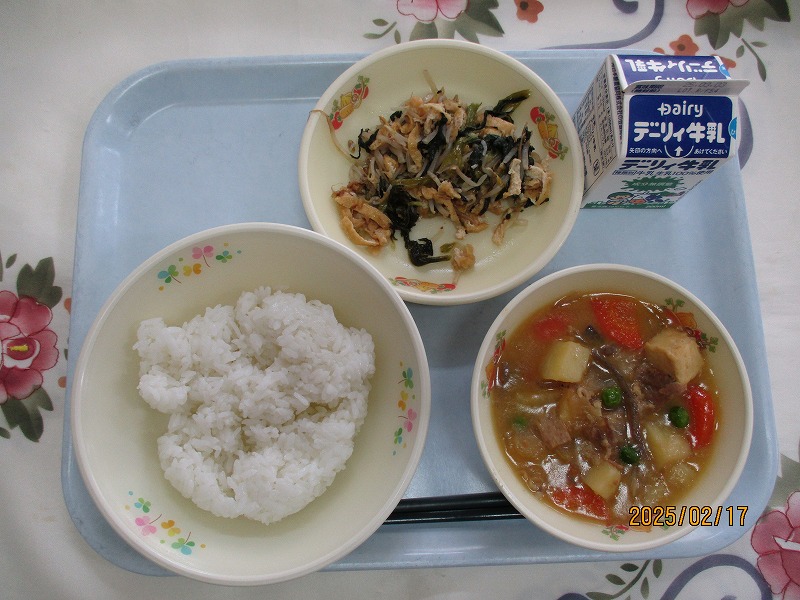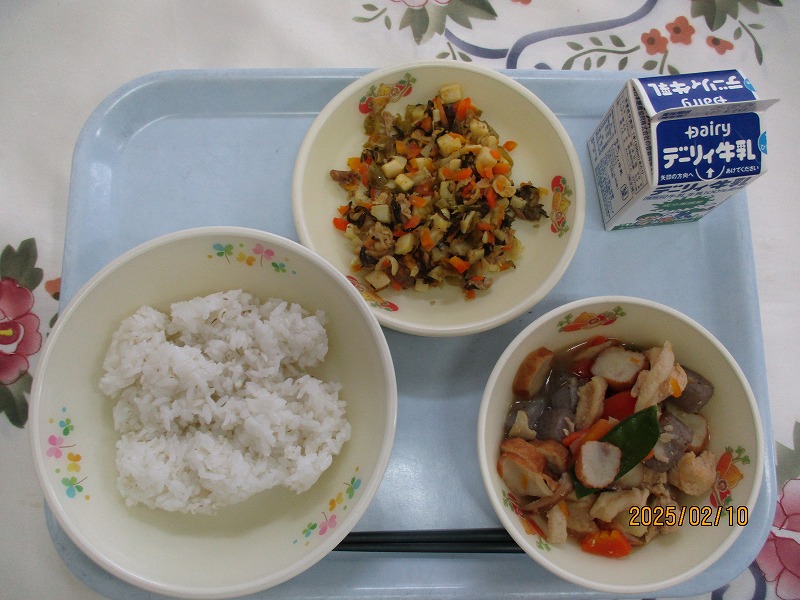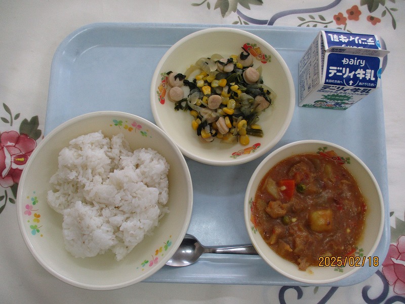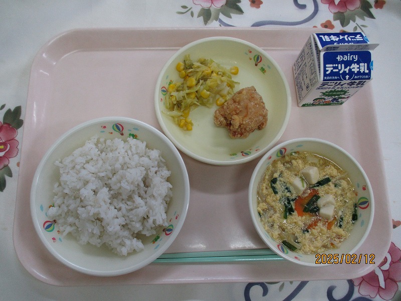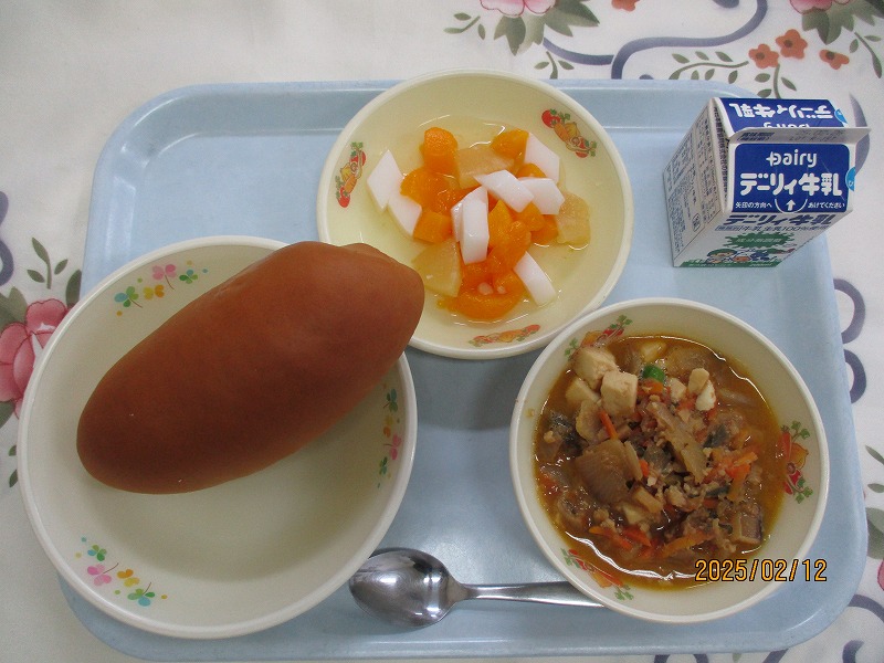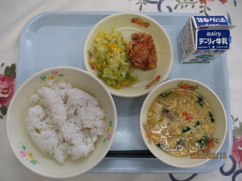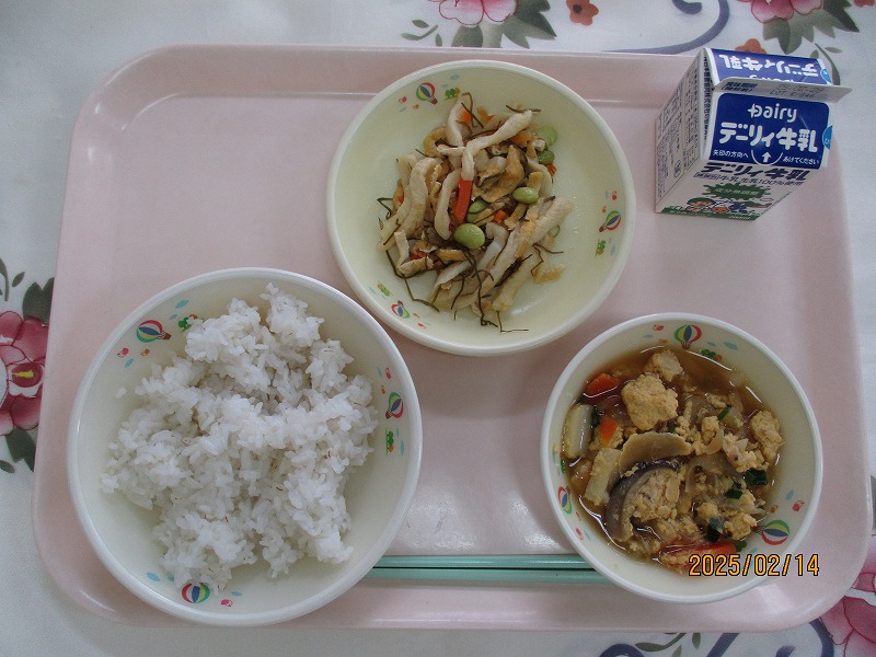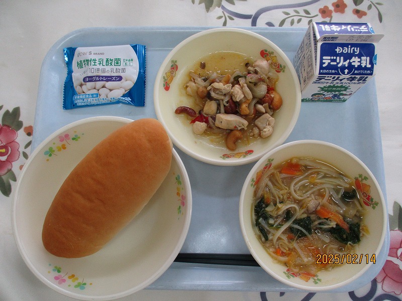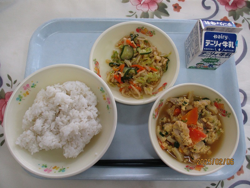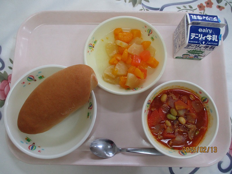 | 2025/02/14 2025年2月13日(木)の給食 【小学校】 コッペパン、牛乳、ポークビーンズ、フルーツミックス だいずは、おもにからだをつくるえいようそをおおくふくんでいるので、「はたけのにく」とよばれています。しょくもつせんいがおおいので、びょうきをよぼうしたり、おなかのちょうしをととのえたりするはたらきがあります。きょうは、ポークビーンズに入っています。 【中学校】 麦ごはん、牛乳、ニラ玉スープ、鶏肉のから揚げ、キャベツソテー ネギ類に含まれている香りの成分のアリシンは、ニラに多く含まれるビタミンB1の吸収を高めてくれます。効果としては血栓の予防や疲労回復があります。炭水化物をエネルギーに変えるとき、ビタミンB1が必要です。しっかり食べるようにしましょう。 |