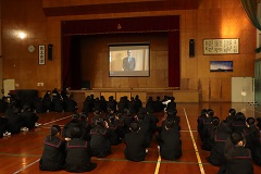 先生たちと後輩からのメッセージ動画を視聴したあと、生徒会長が代表で応援エールを送りました。