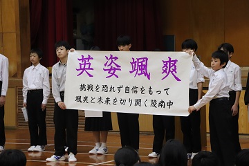 生徒会役員が一生懸命作成したスローガンの旗を示され、これから様々な活動に取り組んでいきます。