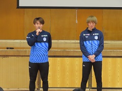 霧島市でキャンプをしているJリーグチーム「モンテディオ山形」の選手2名が来校し、3年生の体育の授業でサッカーを通した「夢クラス」を行いました。