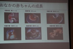 お話は、生命誕生の難しさやすばらしさなどについて、写真や動画等を交えてお話していただき、生徒はとても興味をもって話を聞いていました。