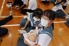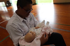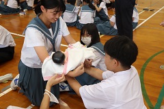 生徒たちに自然を笑顔が広がりました。(写真には、赤ちゃんの人形抱っこしているものもあります)